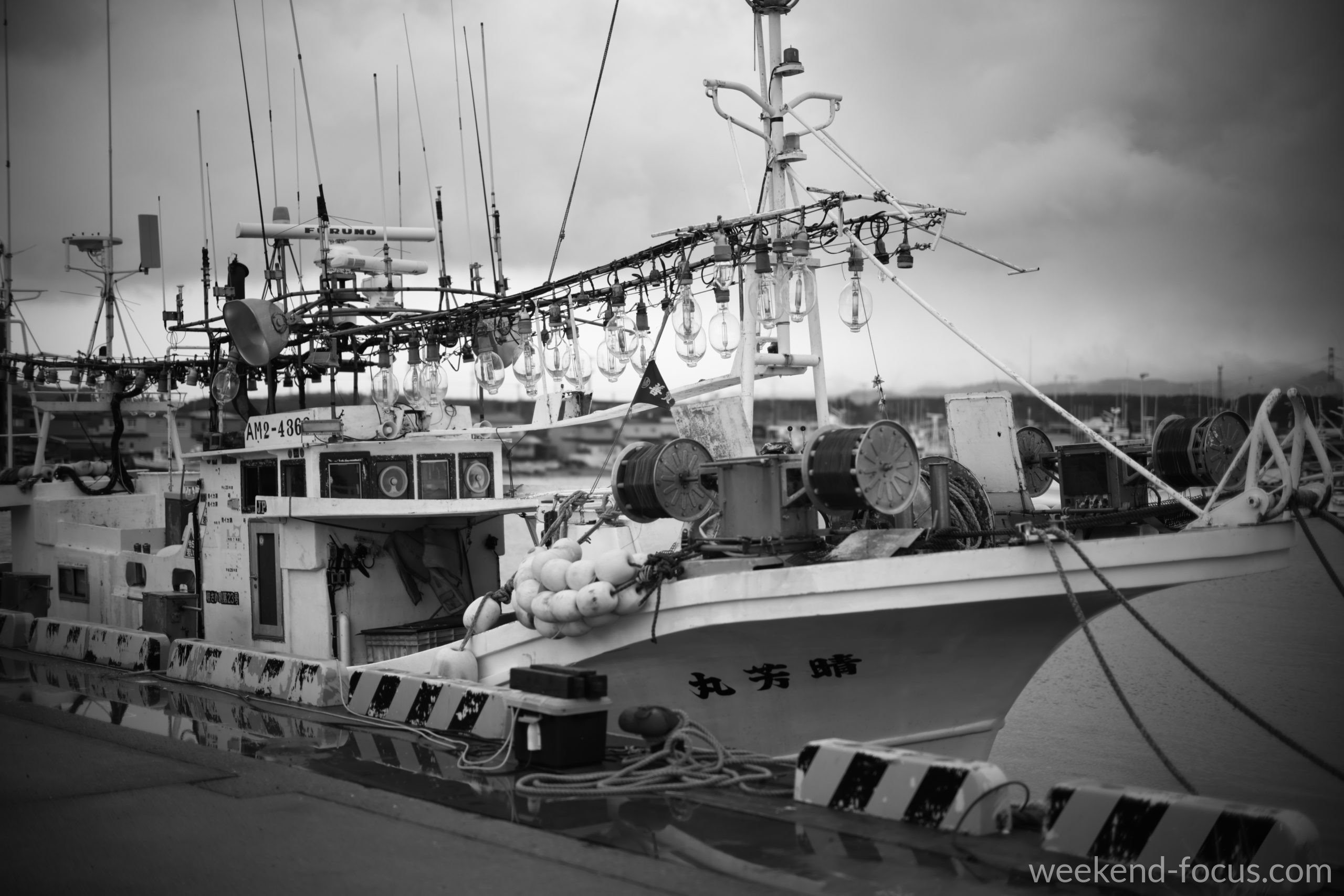 港に停泊する漁船。その甲板で存在感を放つ集魚灯を、まずはモノクロームで捉えました。 開放1.0で描くことで、船体の重厚な質感と、等間隔に並ぶガラスの球体が作り出すリズムがより鮮明になります。冬の港の静寂を象徴するような、凛とした空気感を封じ込めました。