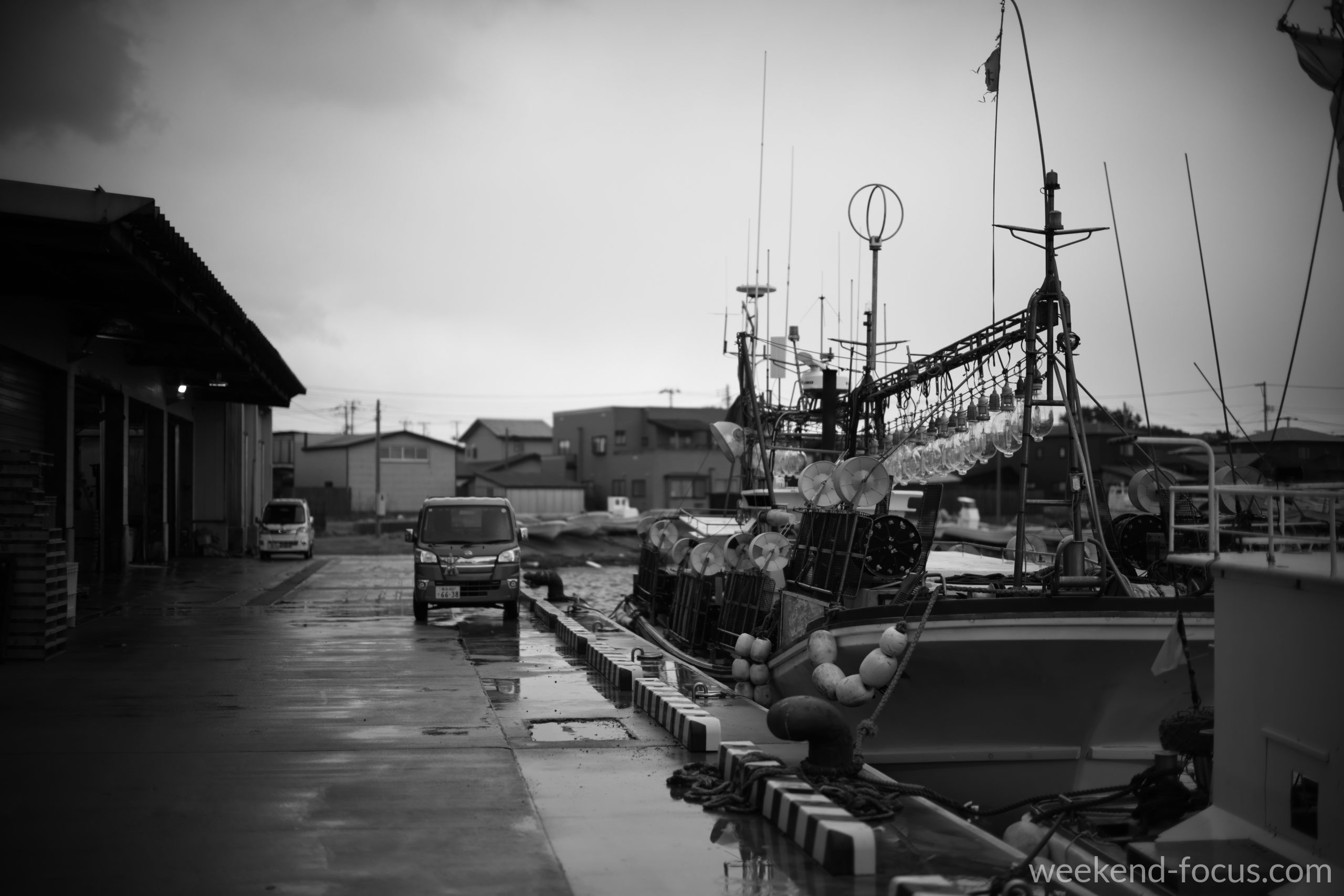 NOKTON 50mm F1, Canon EOS R5, 1/4000, F1.0, ISO 100, 間漁港・漁船(モノクロ)